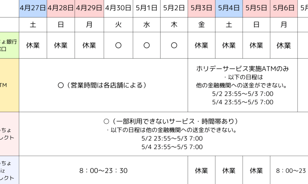 | 銀行名 | 平日営業時間 | 土曜日営業時間 | 日曜日営業時間 |
