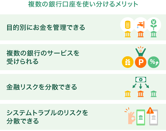 - 資産の分散: 普通預金口座や定期預金口座を別々の銀行に持つことで、リスクを抑えられる。