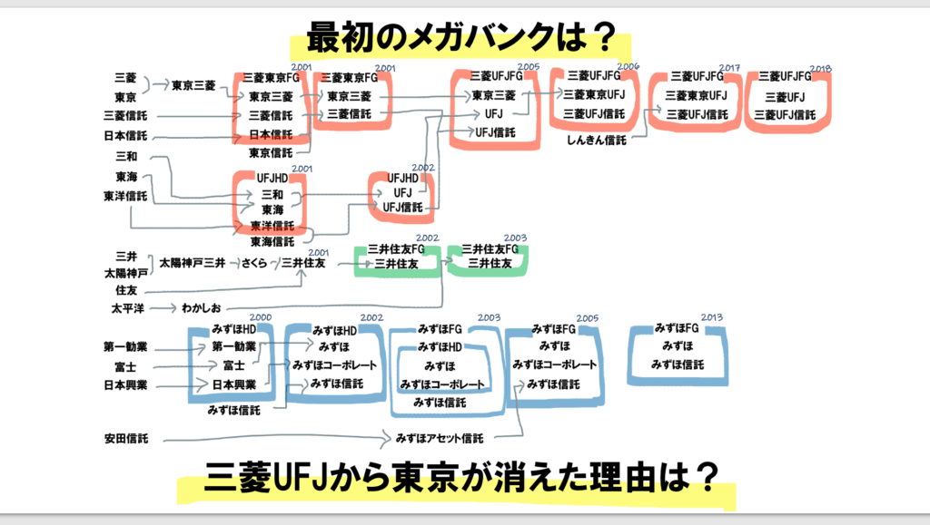 - 2001年: 東京三菱銀行と三和銀行の合併により、UFJ銀行が設立される。