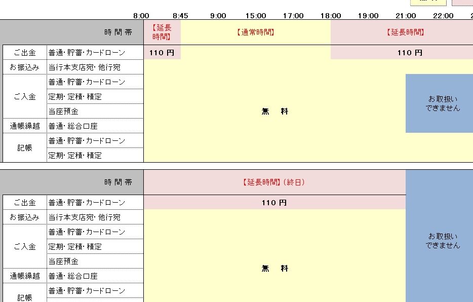 以下は、いくつかの主要支店でのATM営業時間の例です: