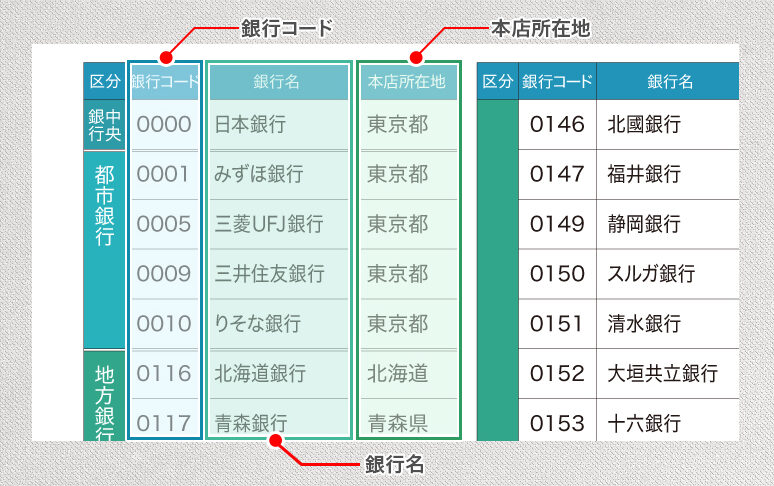- 金融機関コード:各銀行や信用金庫に割り当てられた3桁の数値。