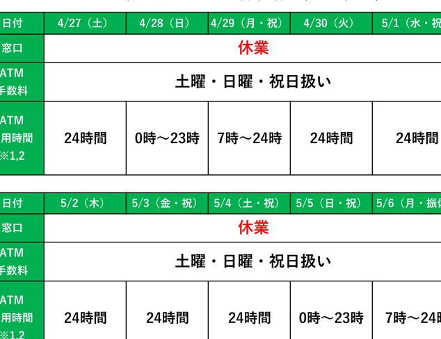以下では、曜日ごとの具体的なATM利用可能時間をまとめました。