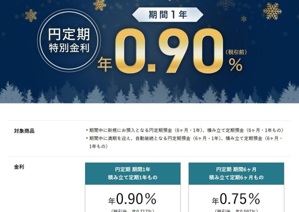 - 定期預金: 預入期間に応じて異なる金利が設定されます。1年、3年など選択肢があります。