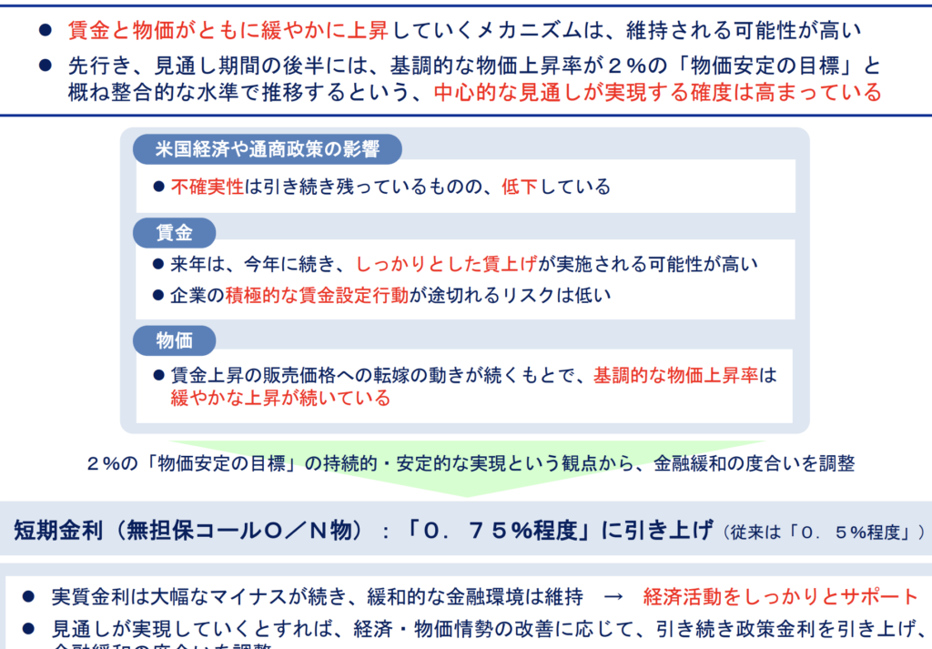 - インフレ圧力: 物価上昇率が持続的に高まり、安定した経済成長を維持するためには金利引き上げが必要とされています。