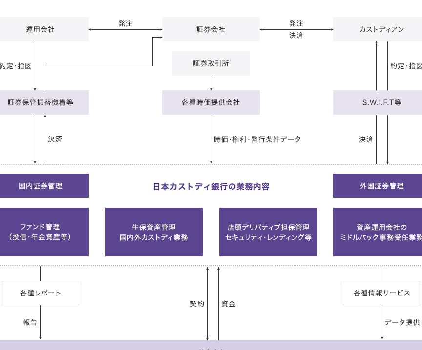 日本カストディ銀行は、金融市場において重要な役割を果たしています。私たちの業務内容には、資産管理、取引の清算、そして顧客への様々なサービスが含まれています。これにより投資家や機関投資家は、安全かつ効率的に資産を運用することが可能になります。