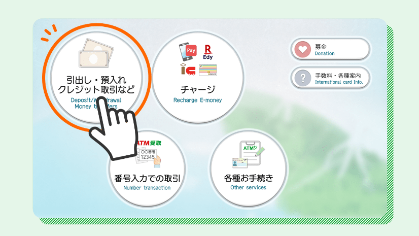 取引メニュー選択: 現金引き出し、預け入れ、振込などから目的の取引を選びます。
