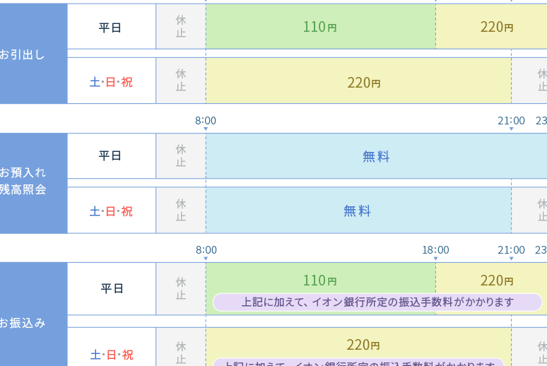 - 手数料:他行ATMを使用すると手数料が発生する場合があります。