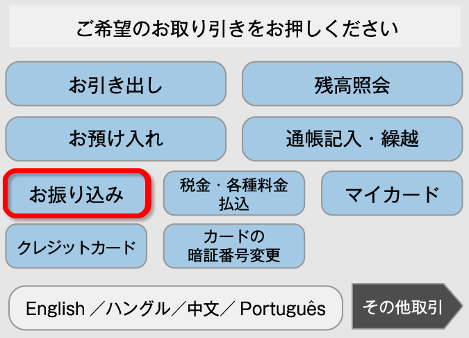 - カード挿入: キャッシュカードを挿入し、暗証番号を入力します。