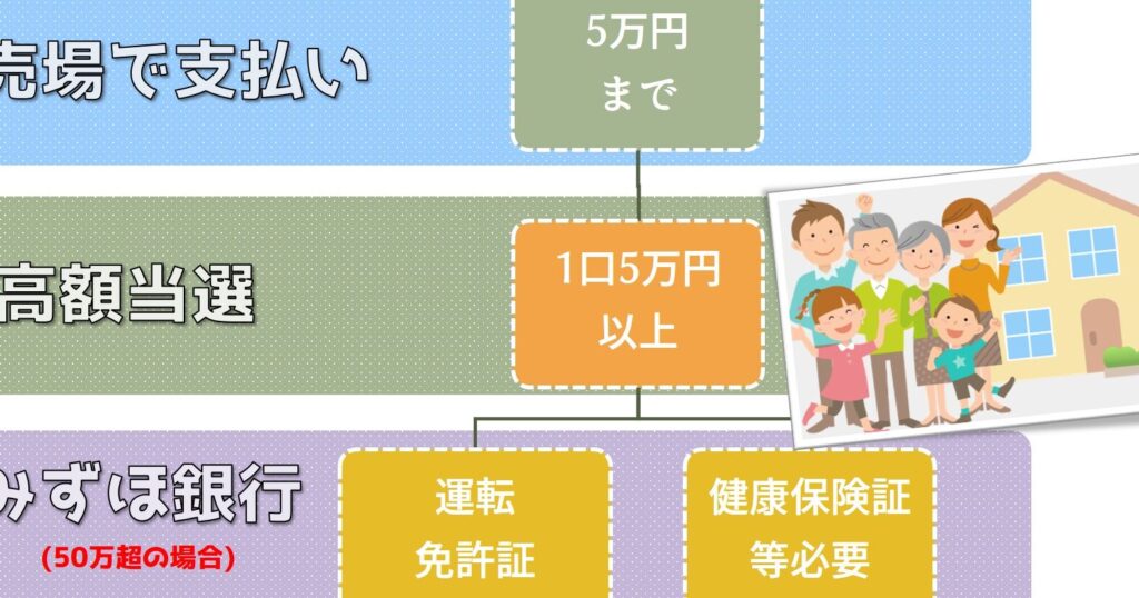 最も一般的な方法は、銀行や宝くじ売り場の窓口で直接受け取ることです。この場合、以下の点に注意が必要です。