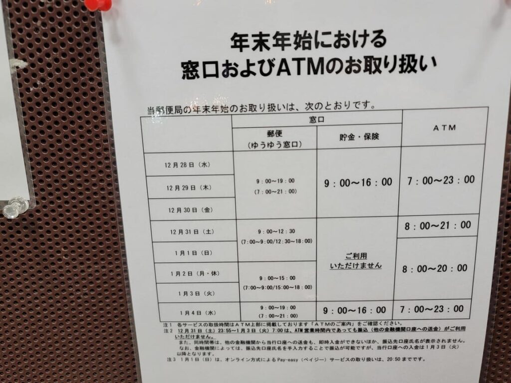 | 元日(1月1日) | 休業(ほとんどの場合) | 一部のATMでは営業中。 |