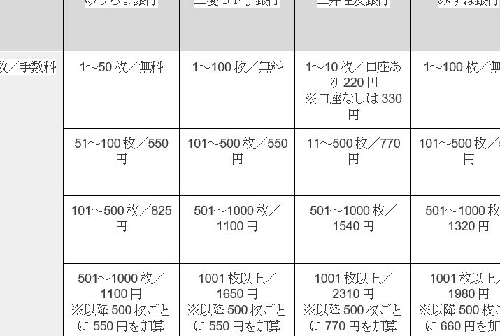 以下は、日本国内で一般的に利用される主要な銀行の両替手数料です。この表では、それぞれの銀行が設定している手数料率を示しています。
