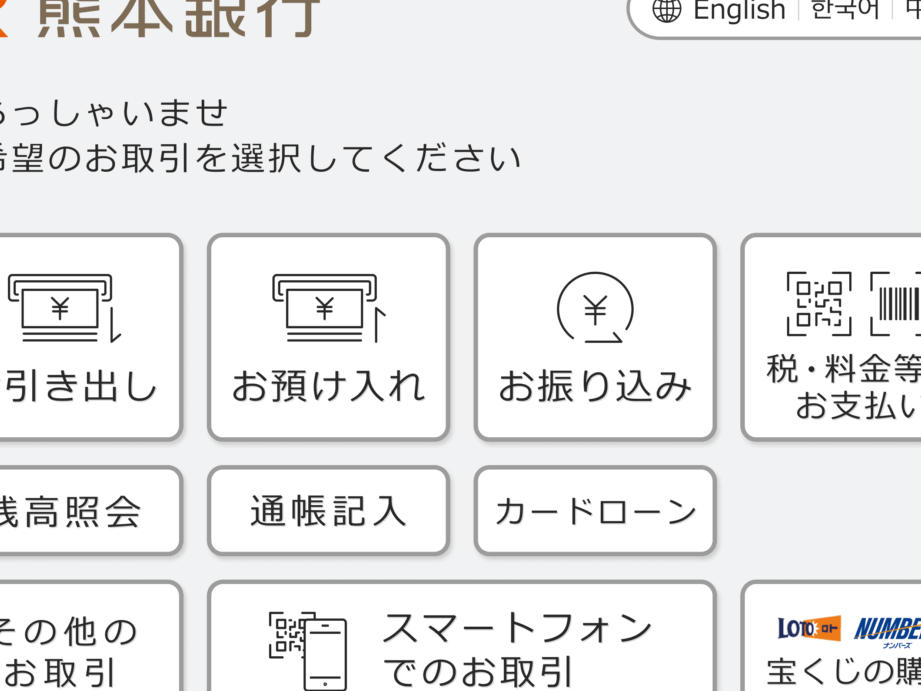 - メニュー選択: 画面上で「硬貨預け入れ」や「現金引き出し」を選択します。